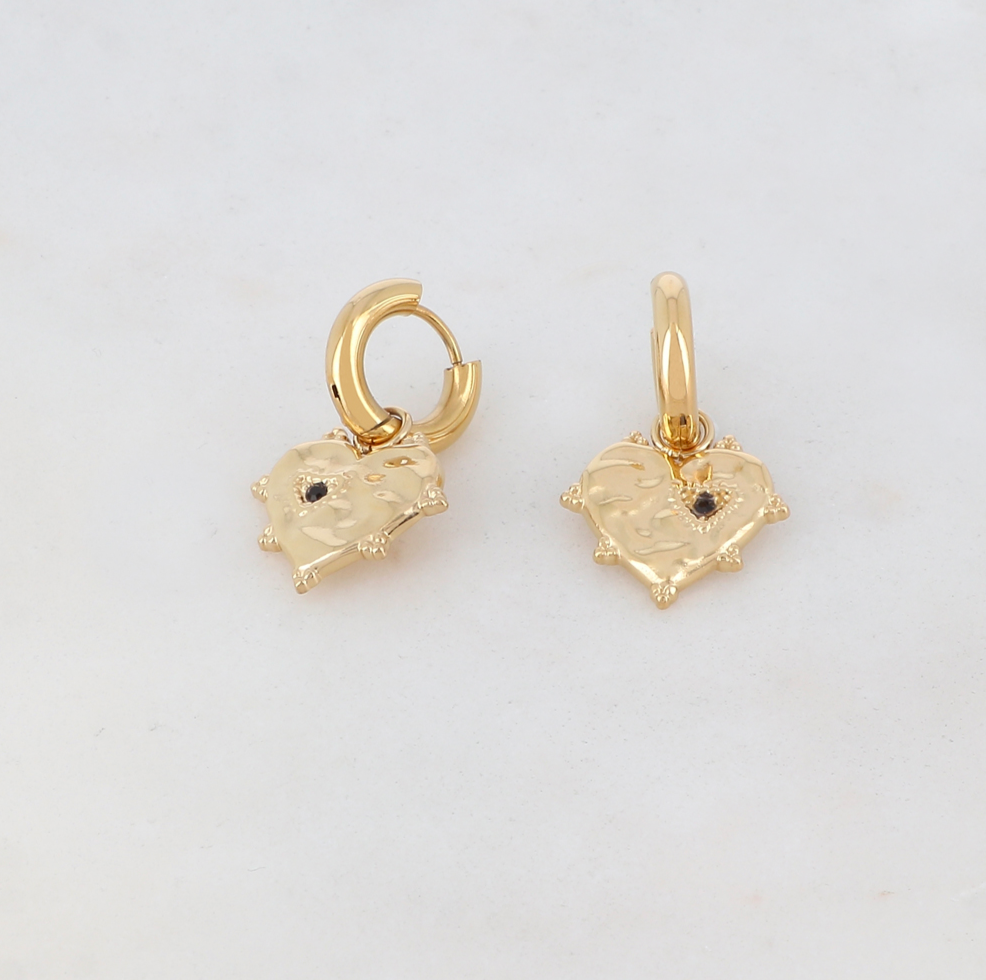 Boucles d'oreilles créoles composées d'un pendant coeur avec un motif coeur et un strass noir. Fermoir charnière.