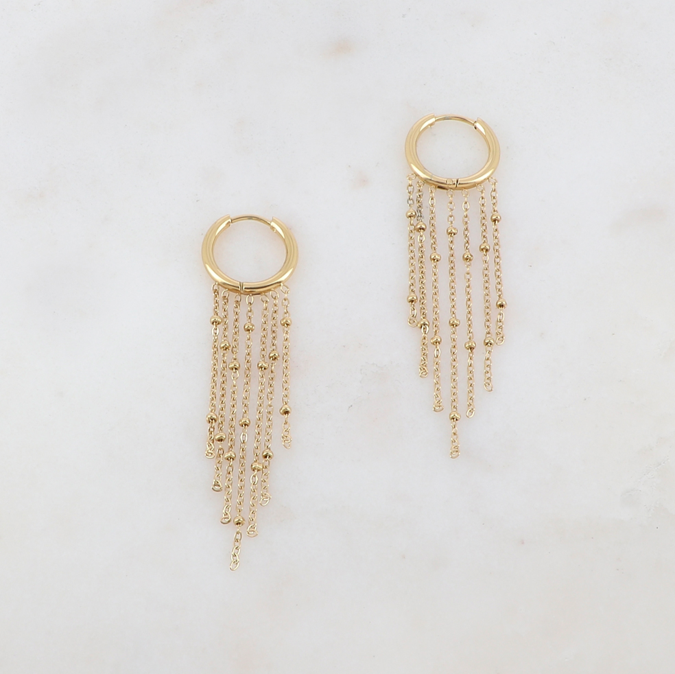 Boucles d'oreilles créoles composées de sept chaînes tombantes avec des petites boules. Fermoir charnière.