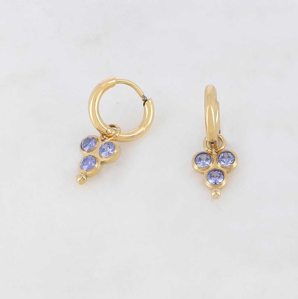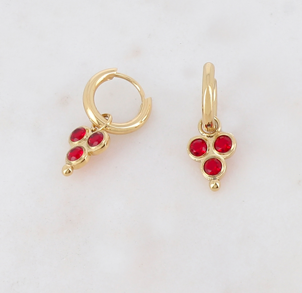 Boucles d'oreilles créoles pendantes embellies de 3 strass colorés.